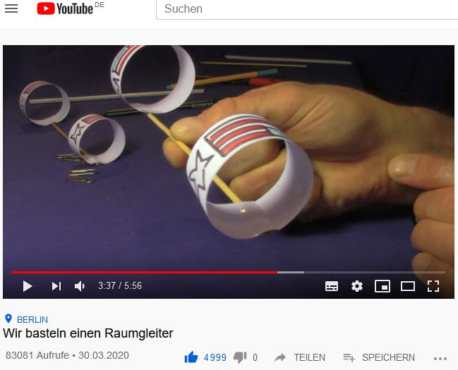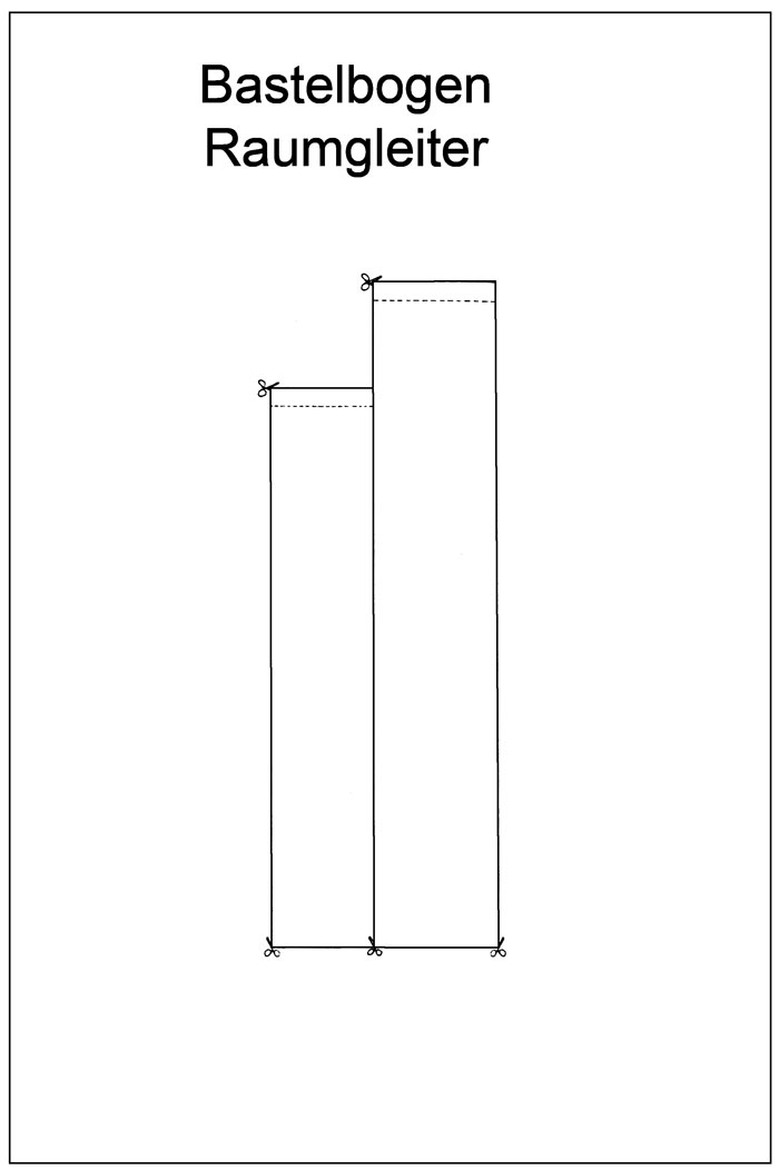 Hier kannst du sehen, wie man einen Raumgleiter bastelt. Du brauchst dazu den Bastelbogen, einen Schaschlikspieß oder einen Strohhalm, eine Schere, Tesafilm, Stifte, und eine Büroklammer.